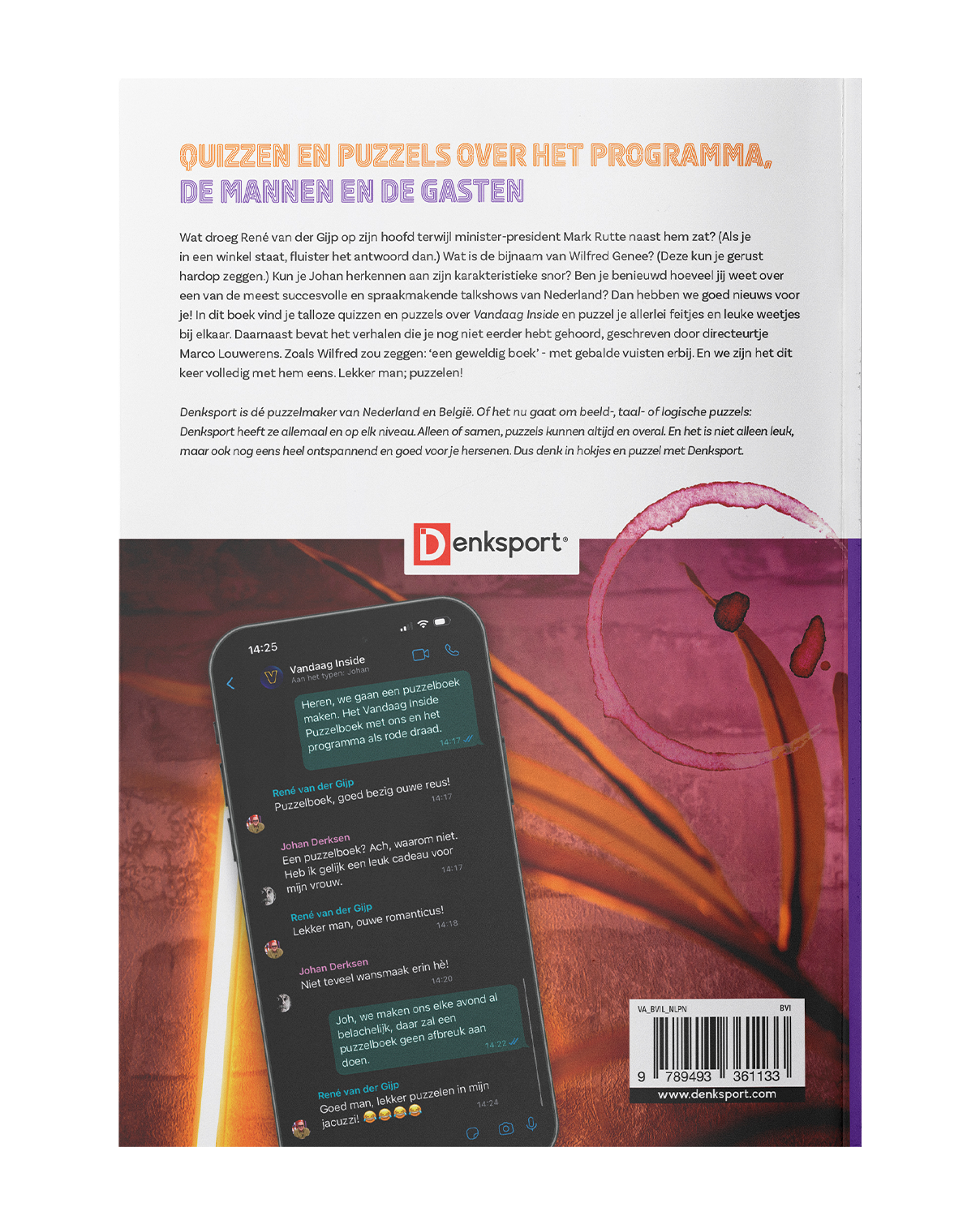 Dan hebben we goed nieuws voor je! In dit boek vind je talloze quizzen en puzzels over Vandaag Inside en puzzel je allerlei feitjes en leuke weetjes bij elkaar. Daarnaast bevat het verhalen die je nog niet eerder hebt gehoord, geschreven door directeurtje Marco Louwerens. Zoals Wilfred zou zeggen: ‘een geweldig boek’ - met gebalde vuisten erbij. En we zijn het dit keer volledig met hem eens. Lekker man; puzzelen!